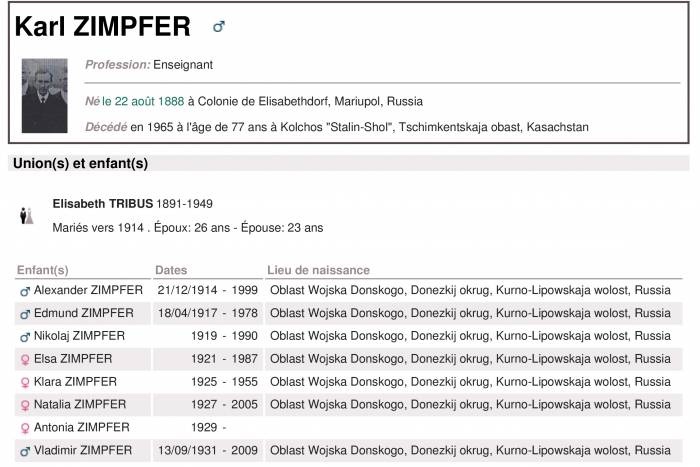 Son fils, Karl Zimpfer (1888-1965) épouse Elisabeth Tribus (1891-1949) vers 1914, et le couple aura sept enfants : Alexander, Edmund, Nikolaj, Elsa, Klara, Natalia, Antonia, Vladimir :