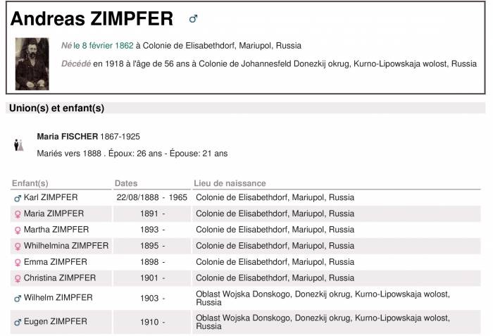 Andreas Zimpfer est né le 8 Février 1862, dans la colonie de Elisabethdorf, Mariupol, Russie, fils de Friedrich et de Anna Maria Jickers, Friedrich étant lui-même le fils de Johann Georg Zimpfer (1787-1861).