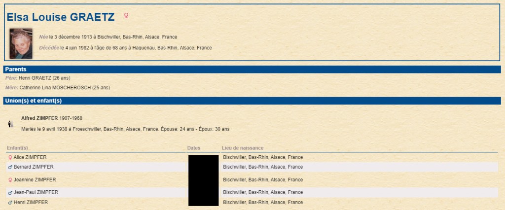 Elsa Louise Graetz est née le 3 Décembre 1913 à Bischwiller, fille de Henri et de Catherine Lina Moscherosch.