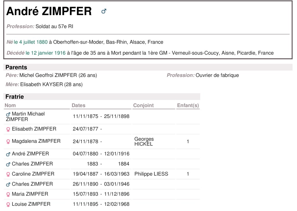 André ZIMPFER was born on 4 July 1880 in Oberhoffen-sur-Moder to Michel Geoffroi ZIMPFER and Elisabeth KAYSER in Alsace, which had been occupied by the German Reich since the Treaty of Frankfurt signed on 10 May 1871.
