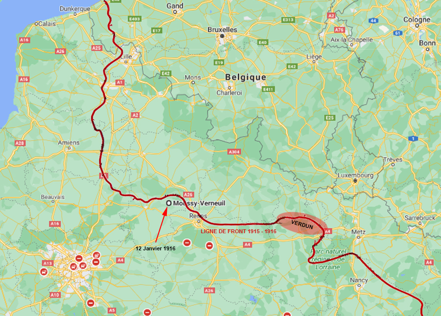 C’est lors d’un bombardement allemand le 12 janvier 1916, que le Soldat Baptiste Déloge sera tué, sur la commune de Moussy-Verneuil dans l’Aisne, non loin du « chemin des dames ».