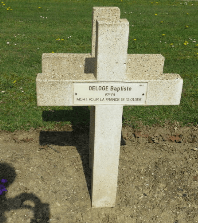 He was first buried in the Château de Verneuil cemetery in Moussy-Verneuil, then transferred to Soupir 1 Necropolis, under the name DELOGE Baptiste, with the words: « Killed by the enemy » and « Died for France » (see his military file).